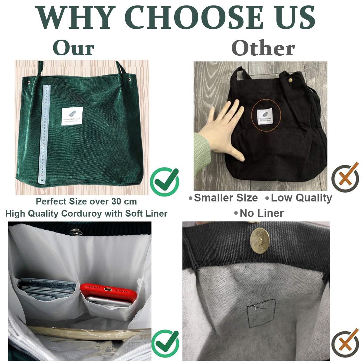 – The corduroy tote bag for women shoulder bag, design with 1 main compartment and 2 small pockets. Aesthetic bag available for book, umbrella, laptop, a4 magazine, sports wear. The inside pocket of canvas tote bag aesthetic is great for organizing smaller items, like mobile phone, wallet, keychain, Earphone, makeups, etc.