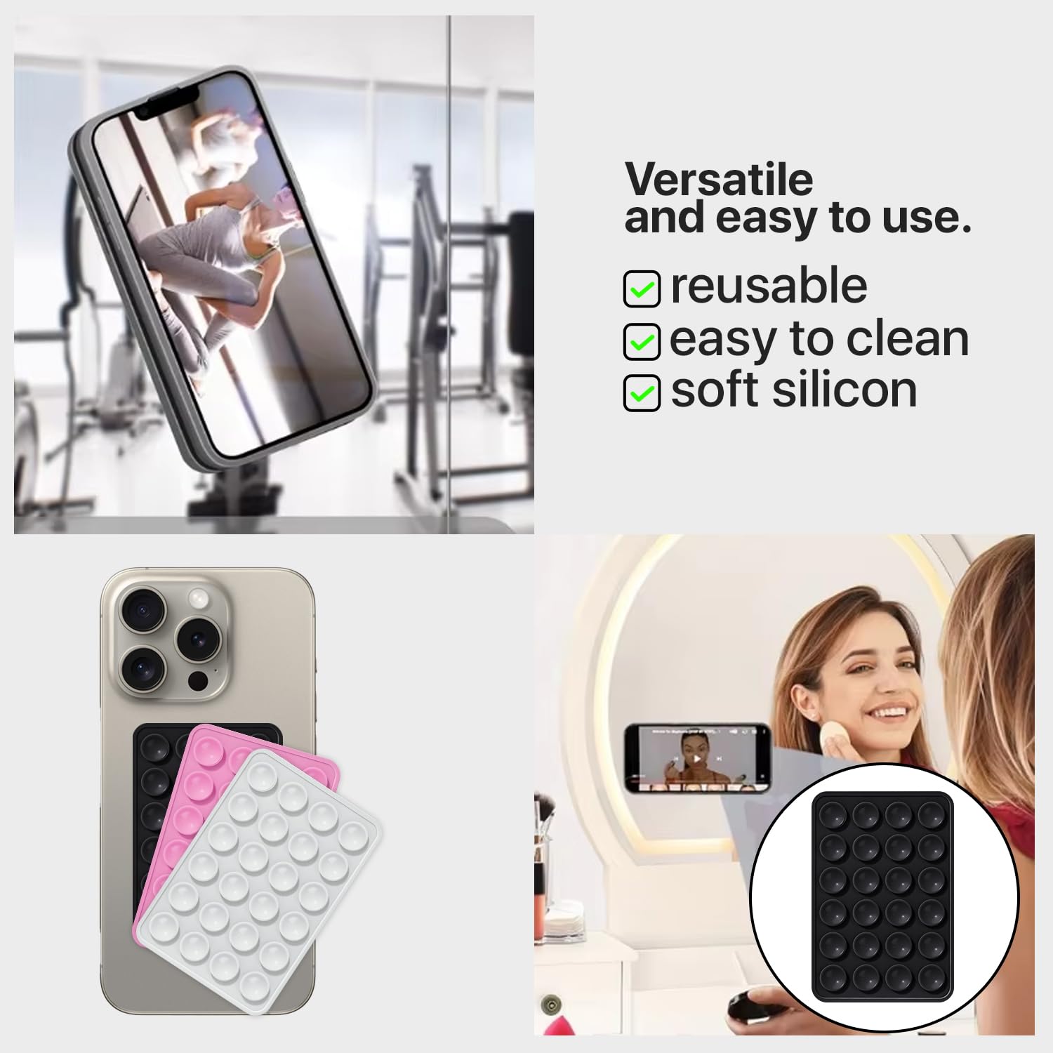 Multitasking Made Easy: Sticks to smooth surfaces like mirrors, shower tiles, or flat areas for hands-free video watching, selfies, or video chats.