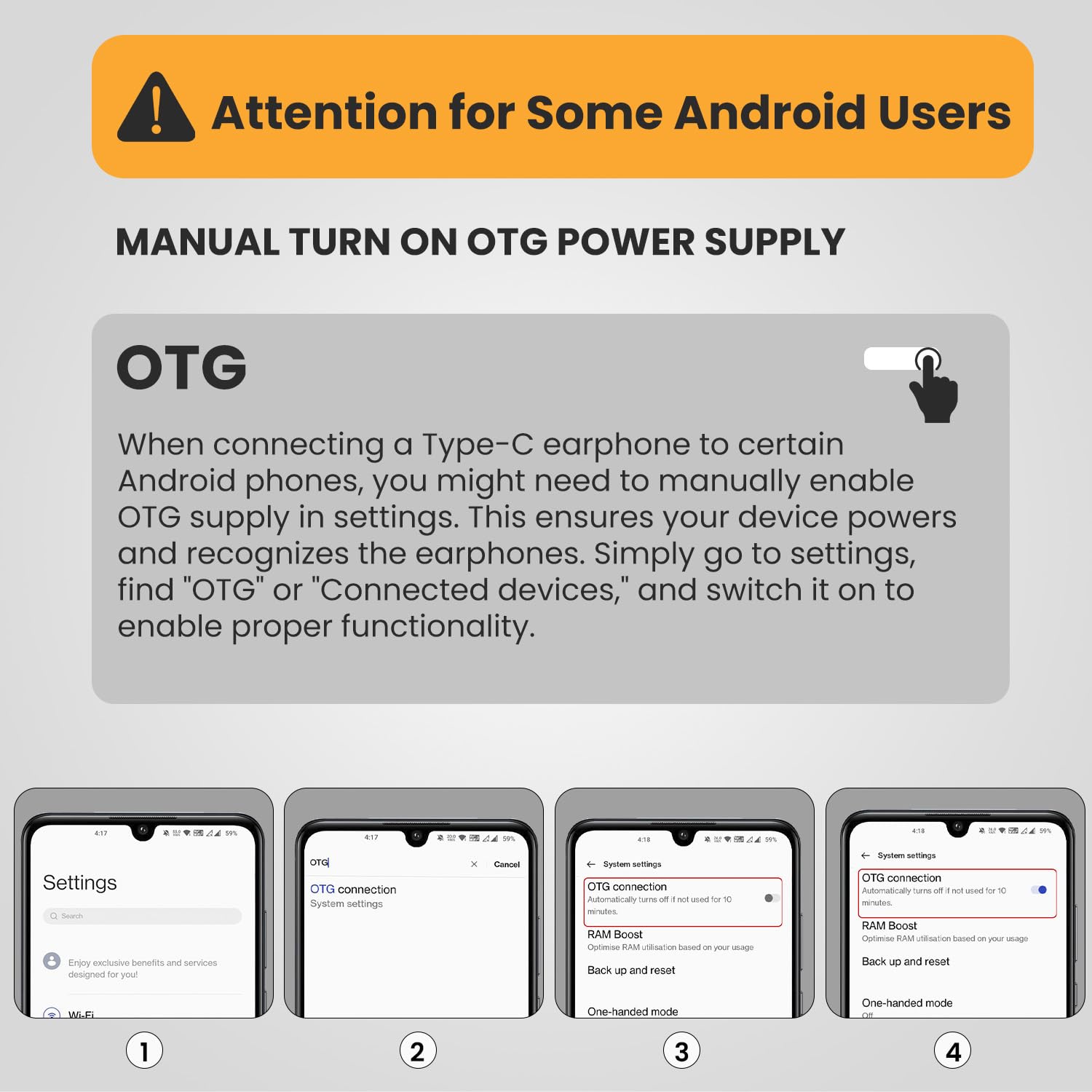 Note: If you encounter connectivity issues with your mobile phone, please open your device settings. Search for ‘OTG’ and enable the ‘OTG Connection’ option. If you experience persistent connection problems, contact our Customer Support for additional assistance.