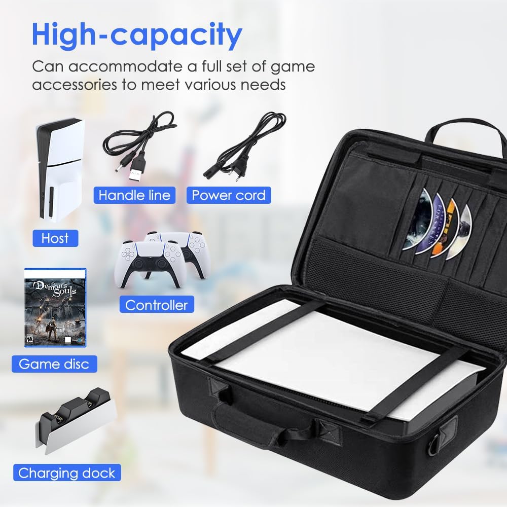 Compact and Portable: This travel bag for PS5 Slim is a briefcase-type carrying case with a waterproof exterior and shoulder strap for convenient portability.