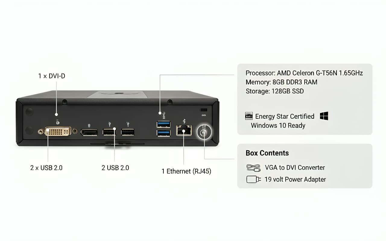 Experience superior computing efficiency with the thin client. This slim-profile device features an AMD G-Series dual-core processor running at 1.65 GHz, paired with 8 GB DDR3 SDRAM and a 128 GB SSD for reliable performance. The system supports memory expansion up to 16 GB, offering flexibility for future upgrades. Running on WES7 operating system, this thin client delivers consistent performance for daily computing tasks. Its compact design makes it an ideal choice for space-conscious workspaces, whilst the solid-state storage ensures quick data access and enhanced reliability. The device comes equipped with DVI output, USB ports, and Gigabit Ethernet connectivity, making it a versatile solution for modern office environments. Perfect for businesses seeking a dependable thin client solution that combines performance with space efficiency.