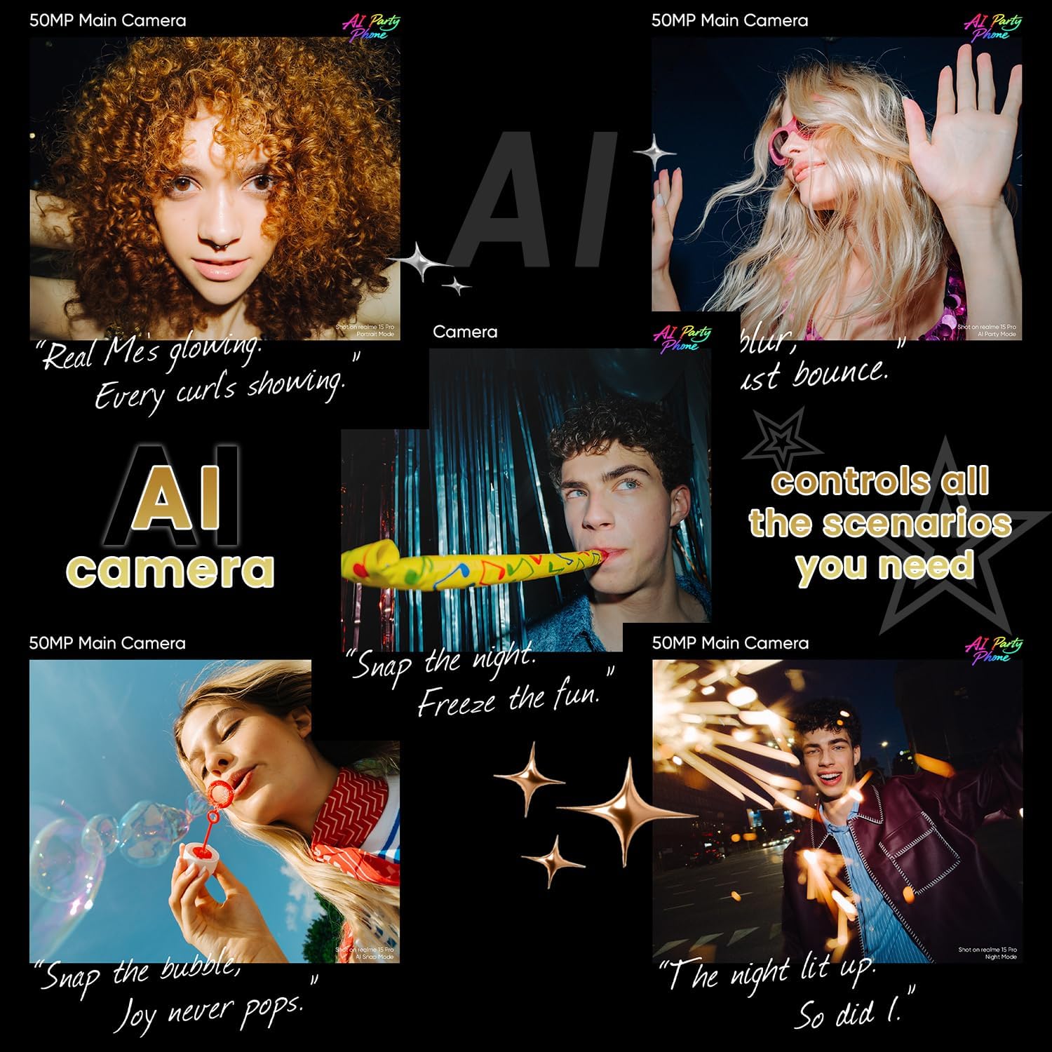 The Realme 15 Pro features a dual 50MP camera system and a 50MP front camera capable of 4K/60fps video. Enhanced by AI-powered tools like voice-controlled editing and Party Mode, it excels for both social content and creative photography.