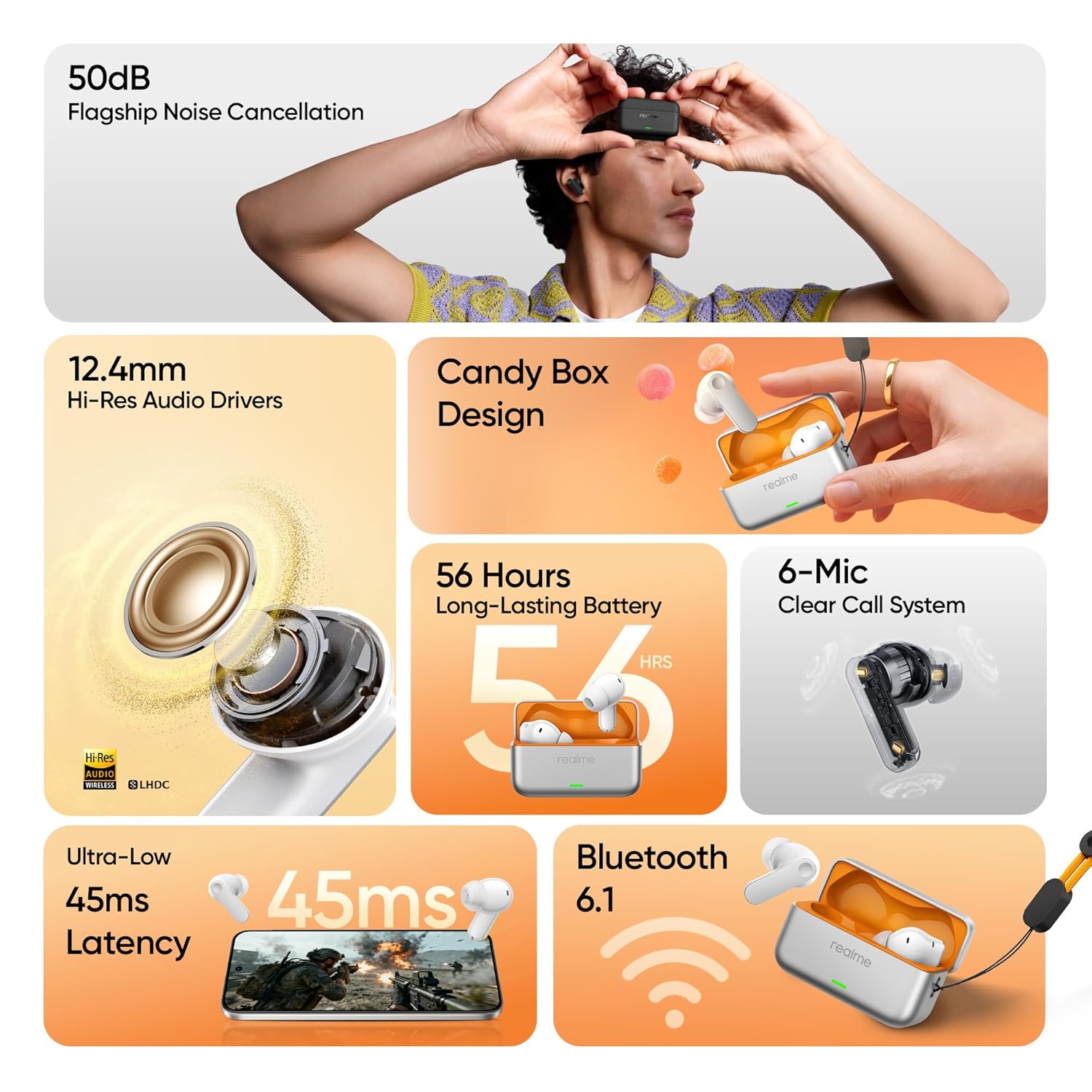 realme Buds T500 Pro True Wireless Stereo Earbuds with 12.4mm Drivers, 3D Spatial Audio, 56H Playtime, AI ENC, IP55 Rating, and 45ms Low Latency (Orange Mint)