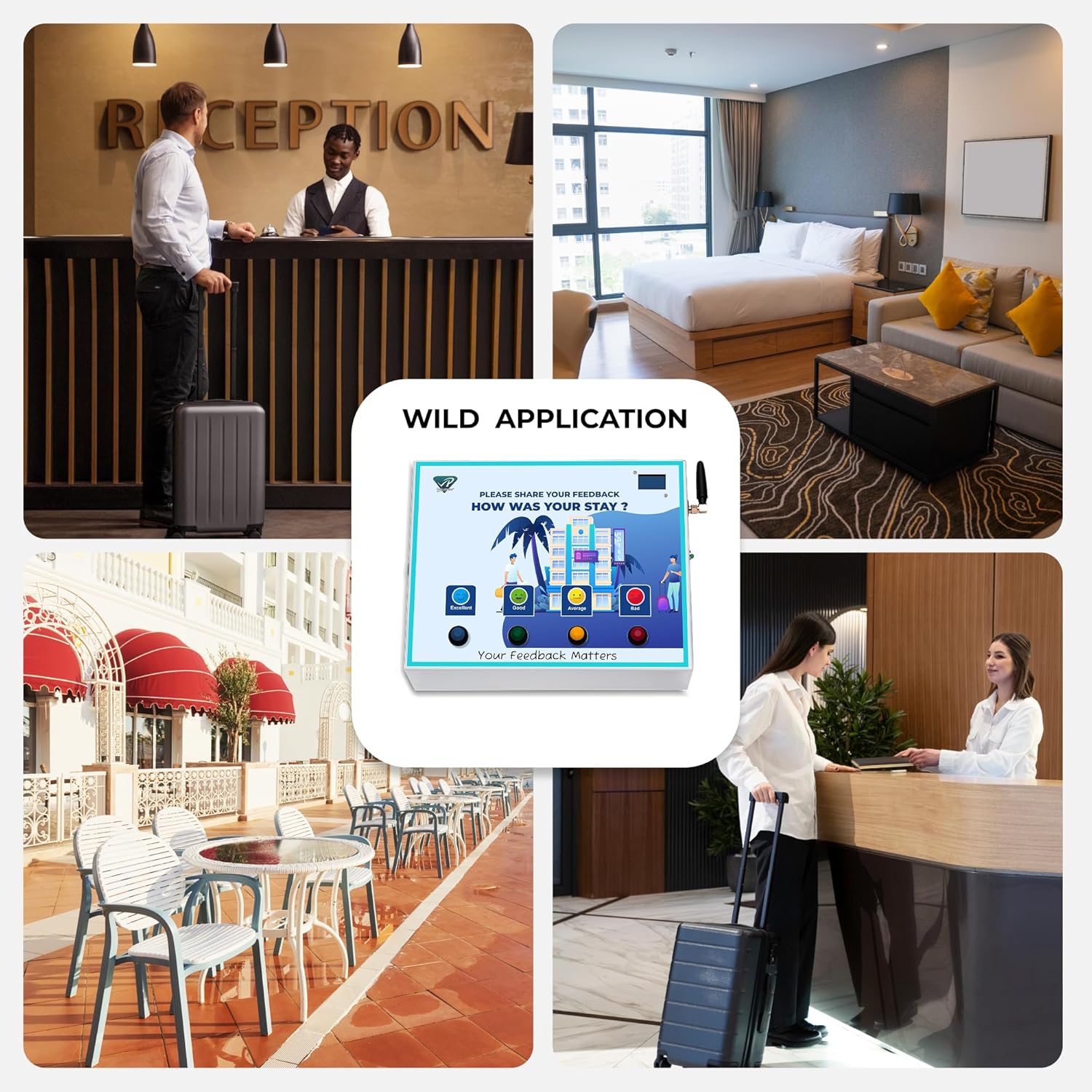 INBUILT WiFi HOTSPOT – NO INTERNET REQUIRED SMILEY-BASED FEEDBACK SYSTEM: Simple and intuitive smiley buttons (Happy, Neutral, Sad) Access real-time feedback, analytics, charts, and performance trends directly on the Android app. Quick plug-and-play install with mounting kit; low power use and reliable long-term operation.