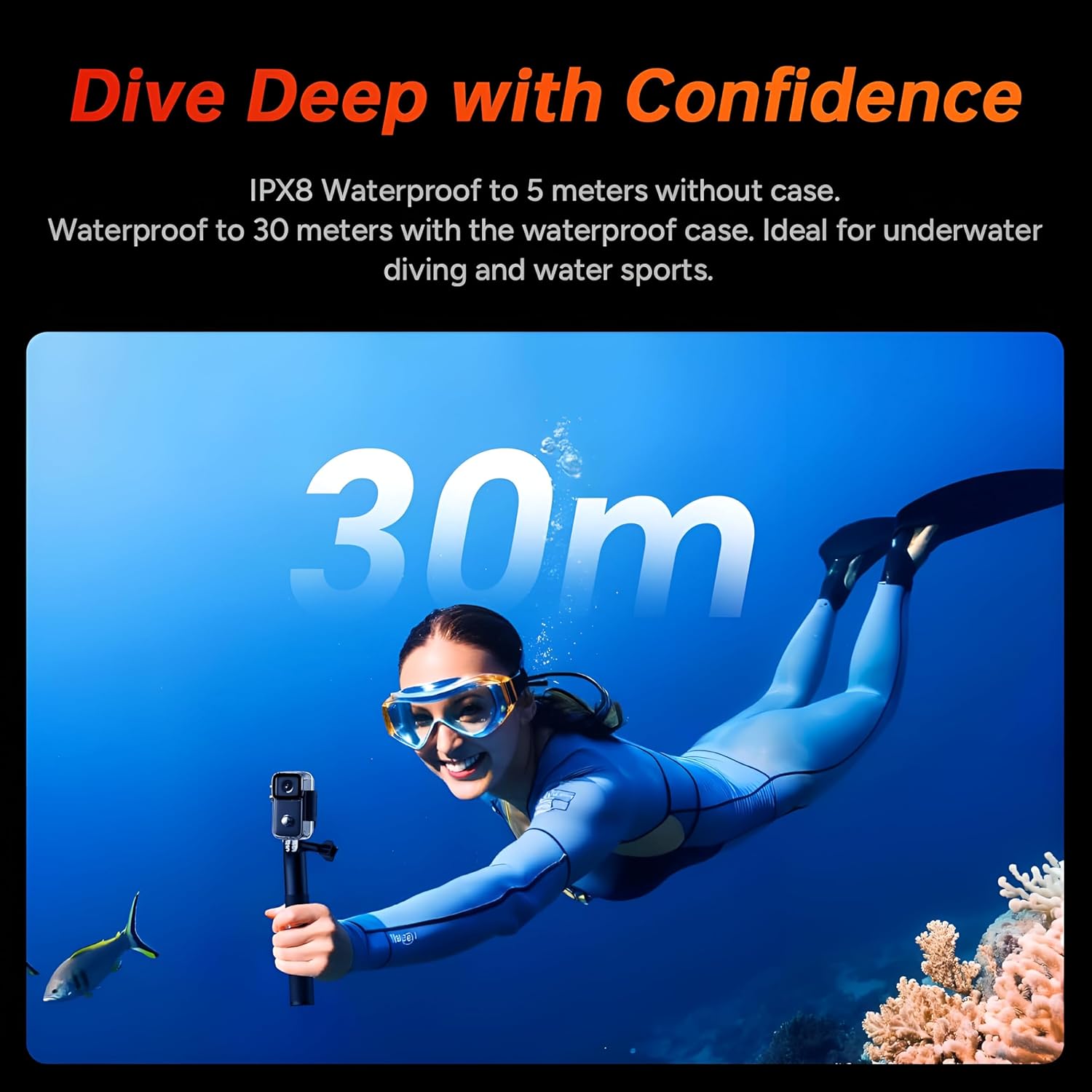 𝐖𝐚𝐭𝐞𝐫𝐩𝐫𝐨𝐨𝐟 & 𝟏𝟐𝟎𝟎𝐦𝐀𝐡 𝐁𝐚𝐭𝐭𝐞𝐫𝐲 : Waterproof to 5M without a waterproof case and 40M includes a case that provides waterproof. 1200mAh Non Removable Battery and fast charging Type-C Cable