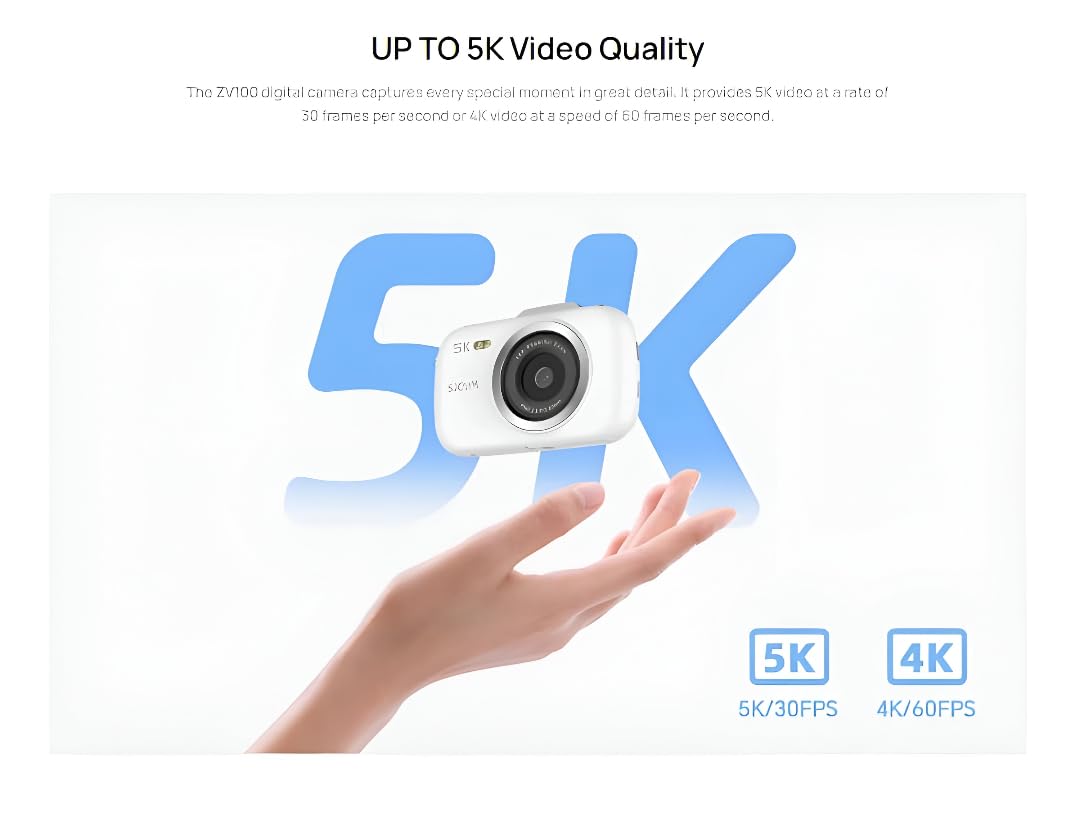 SJCAM ZV100 5K 80MP Digital Camera | 18X Digital Zoom with 5 Preset Modes, 750mAh Digital Point and Shoot Camera for Vlogging Beginners (White)
