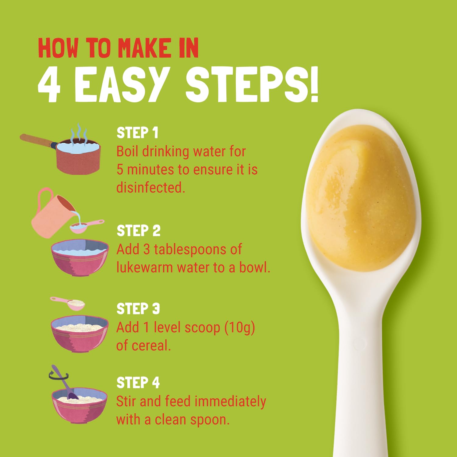 Instant Cereal- Mix with boiled water, stir and feed. Can be served with Ghee, lime, and cooked sweet potatoes, peas, and carrots and great for travel