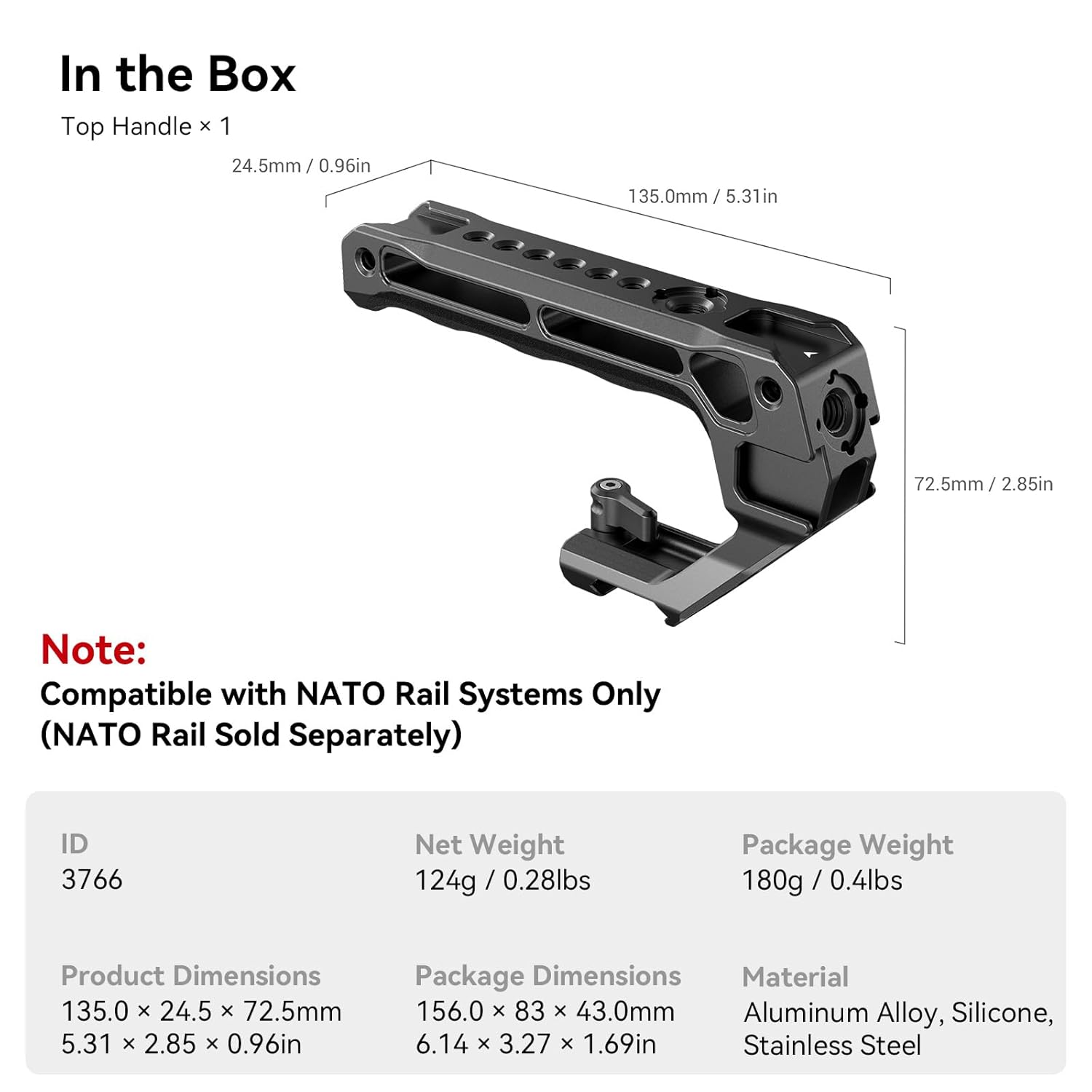 SmallRig Lightweight NATO Top Handle, Quick Release NATO Grip for DSLR Camera Cage, Universal Top Handle with 5 Cold Shoe Adapters and NATO Clamp (Lite) – 3766,Black