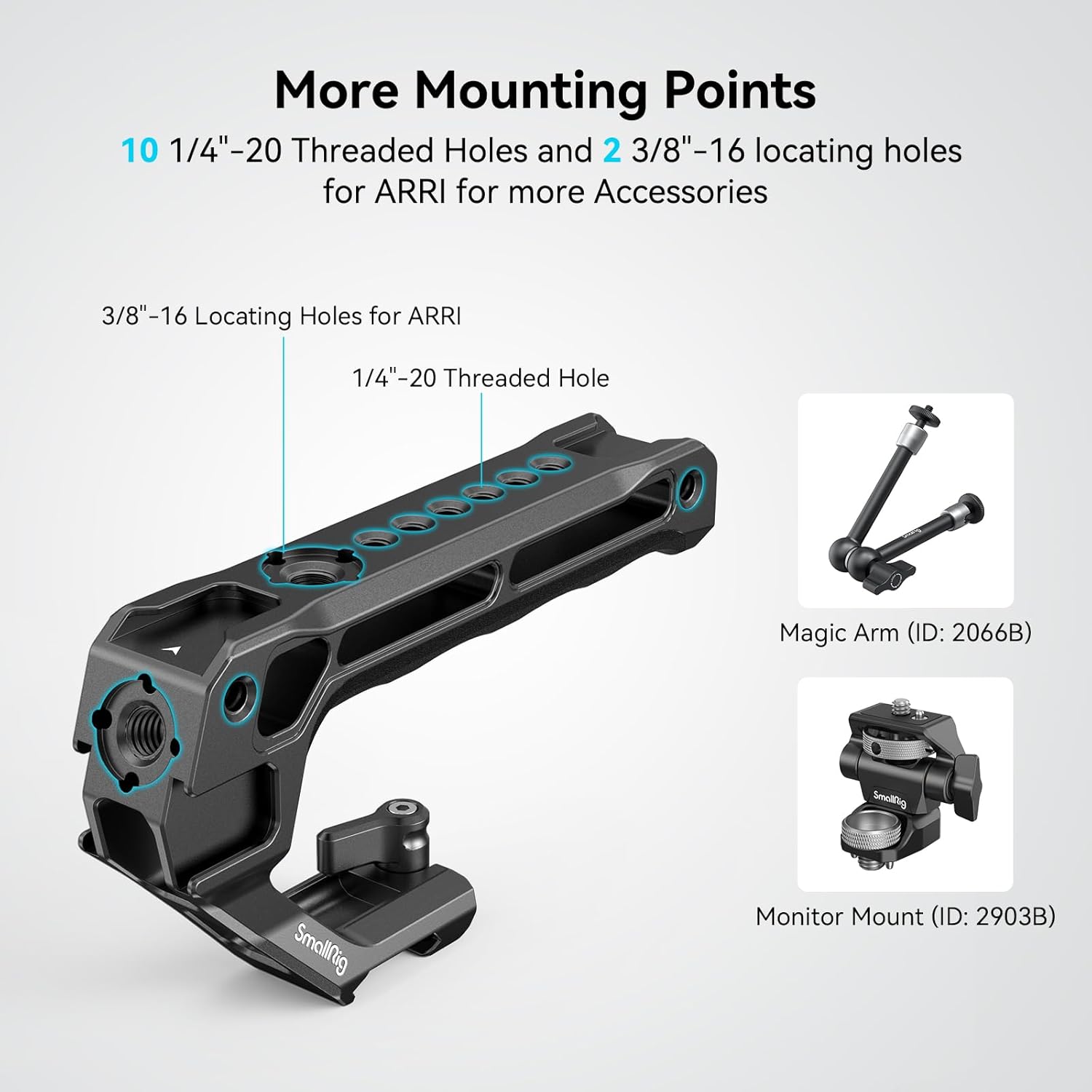 12 Threaded Holes: Ten 1/4″ threaded holes and two 3/8″ threaded holes for arri could attach more accessories, such as monitor mount 2903B and magic arm 2066B.