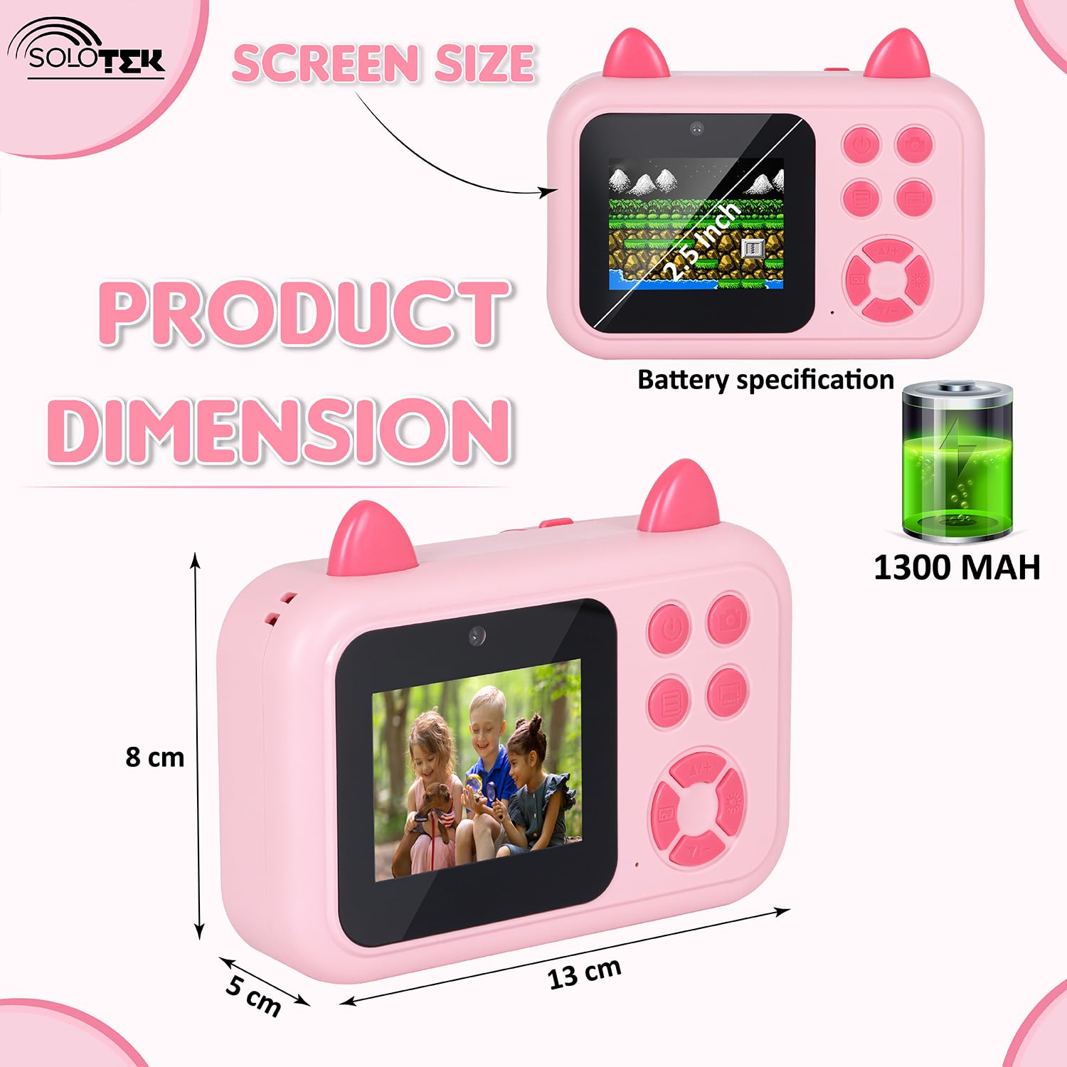 *Long Battery* : SOLOtek Digital camera for kids have 1300 MAH battery | Charging time 1.5 hours | On Full charge continuously works for 15-20 hours.