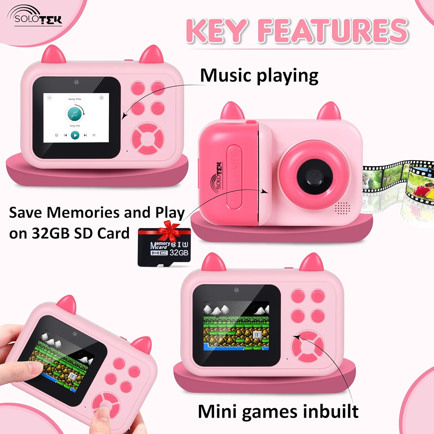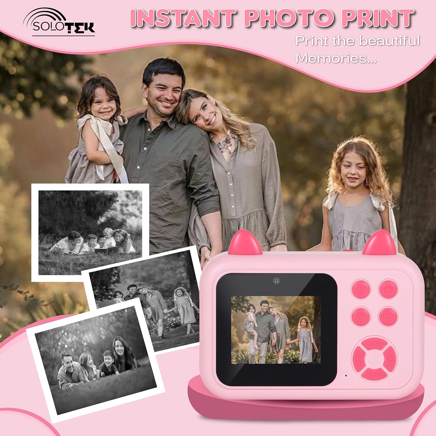 *HD Clear Printing* : SOLOtek the camera with instant photo has a cute look and a small size. More importantly, this is useful in mini camera for photography for kids. This mini camera for kids has clear printing and high-definition imaging.