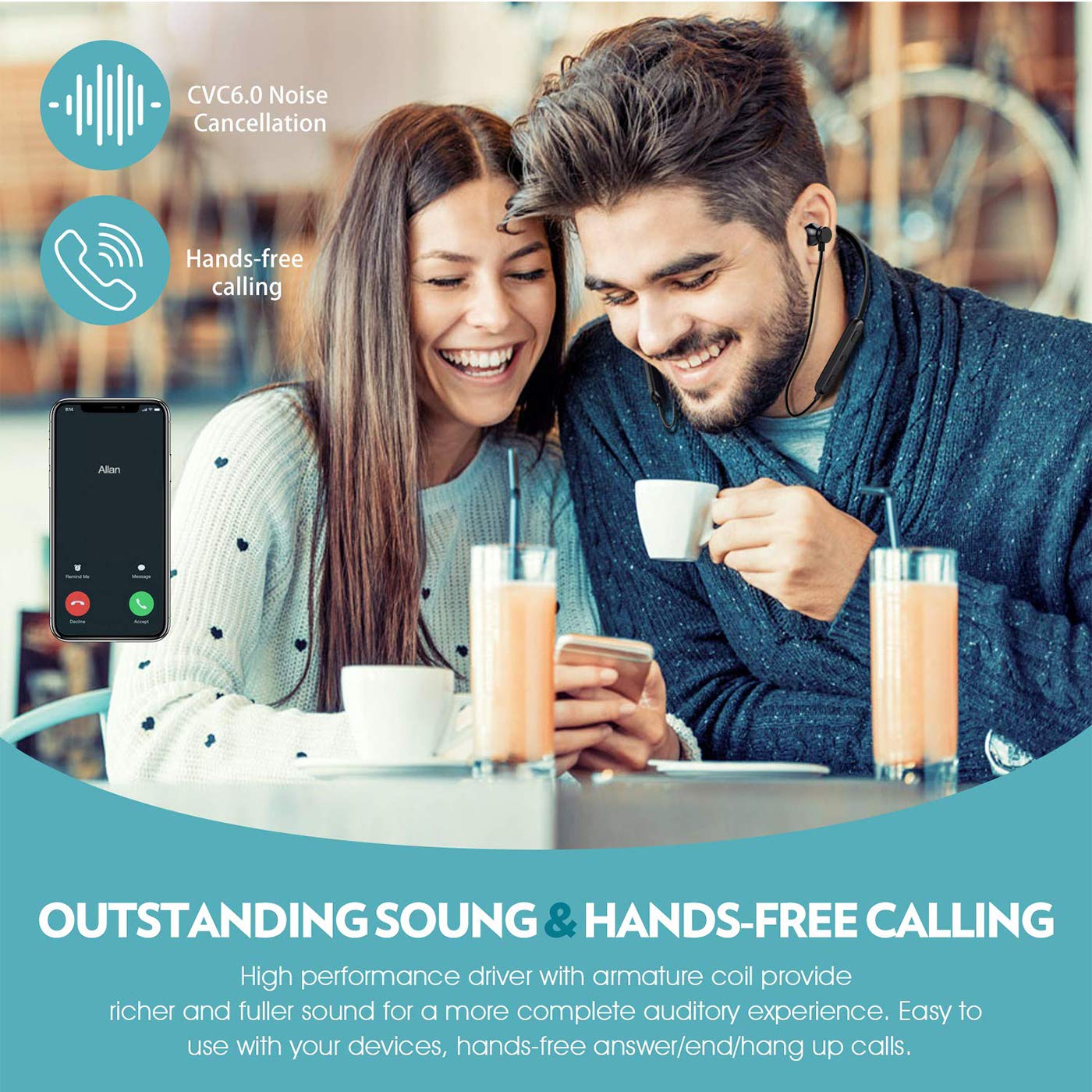 Along with Noise-cancelling microphone, this Bluetooth headphones prevents you from background noise (CvC 6.0), and high performance driver with armature coil provide richer and fuller sound for a more complete auditory experience.