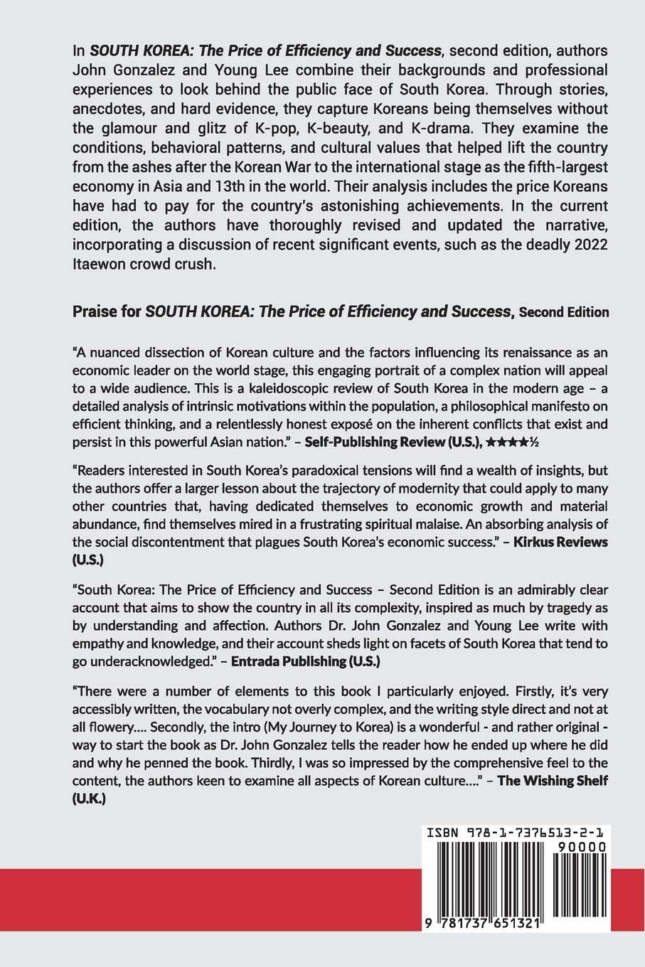 In SOUTH KOREA: The Price of Efficiency and Success, second edition, authors John Gonzalez and Young Lee combine their backgrounds and professional experiences to look behind the public face of South Korea. Through stories, anecdotes, and hard evidence, they capture Koreans being themselves without the glamour and glitz of K-pop, K-beauty, and K-drama. They examine the conditions, behavioral patterns, and cultural values that helped lift the country from the ashes after the Korean War to the international stage as the fifth-largest economy in Asia and 13th in the world. Their analysis includes the price Koreans have paid for the country’s astonishing achievements and the existing social inequality. In the current edition, the authors have thoroughly revised and updated the narrative, incorporating a discussion of recent significant events, such as the deadly 2022 Itaewon crowd crush.