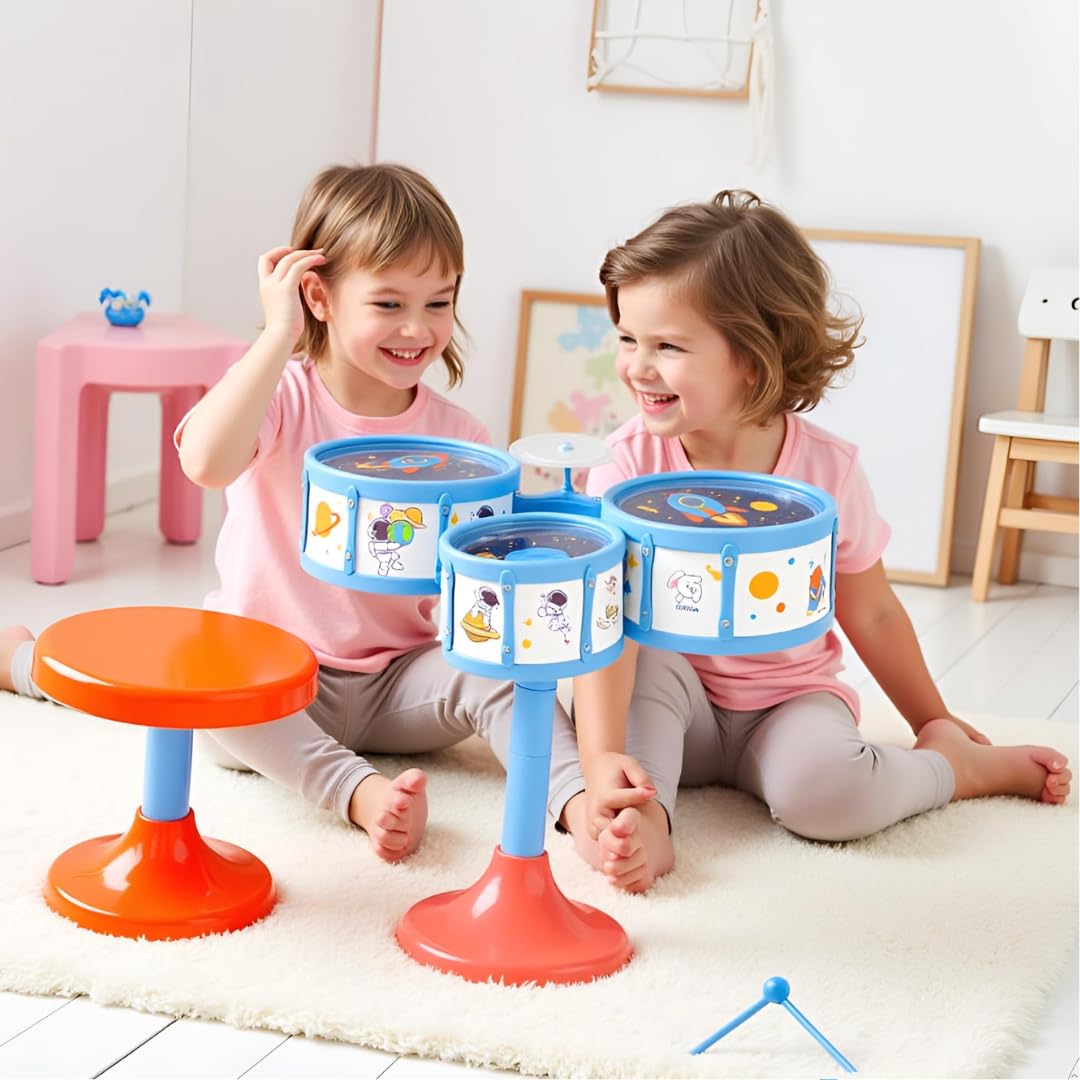🥁 Complete Drum Set for Kids – Includes 3 colorful drums, 1 cymbal, 2 sticks, and a stool. A perfect drum set for kids aged 3+ to play, learn, and perform!