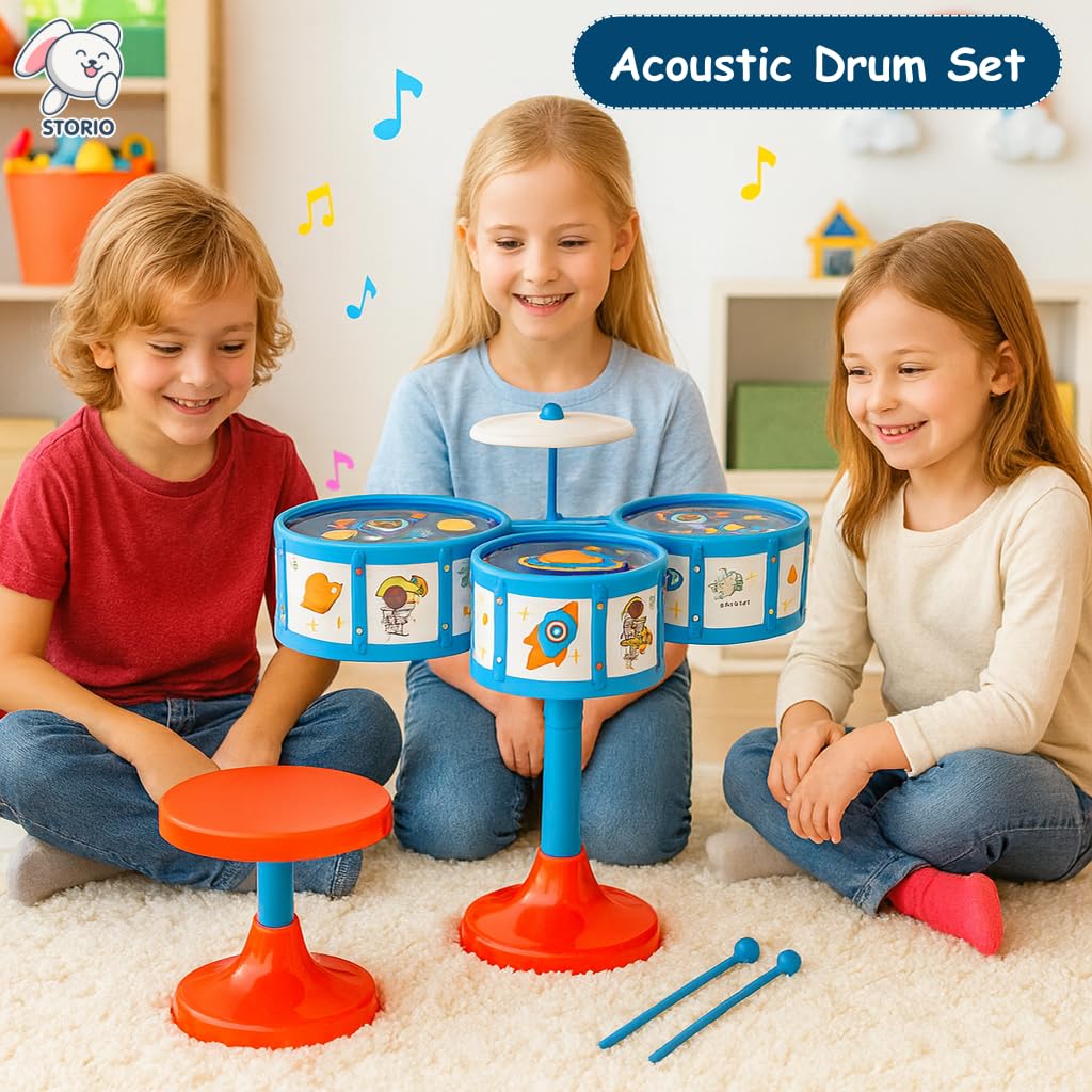 Storio Jazz Drum Set for Kids | Musical Toy Set with 3 Drums, 1 Cymbal, Drumsticks & Stool | Durable Plastic Learning Toy Music Instrument for Boys & Girls for 3 Years+
