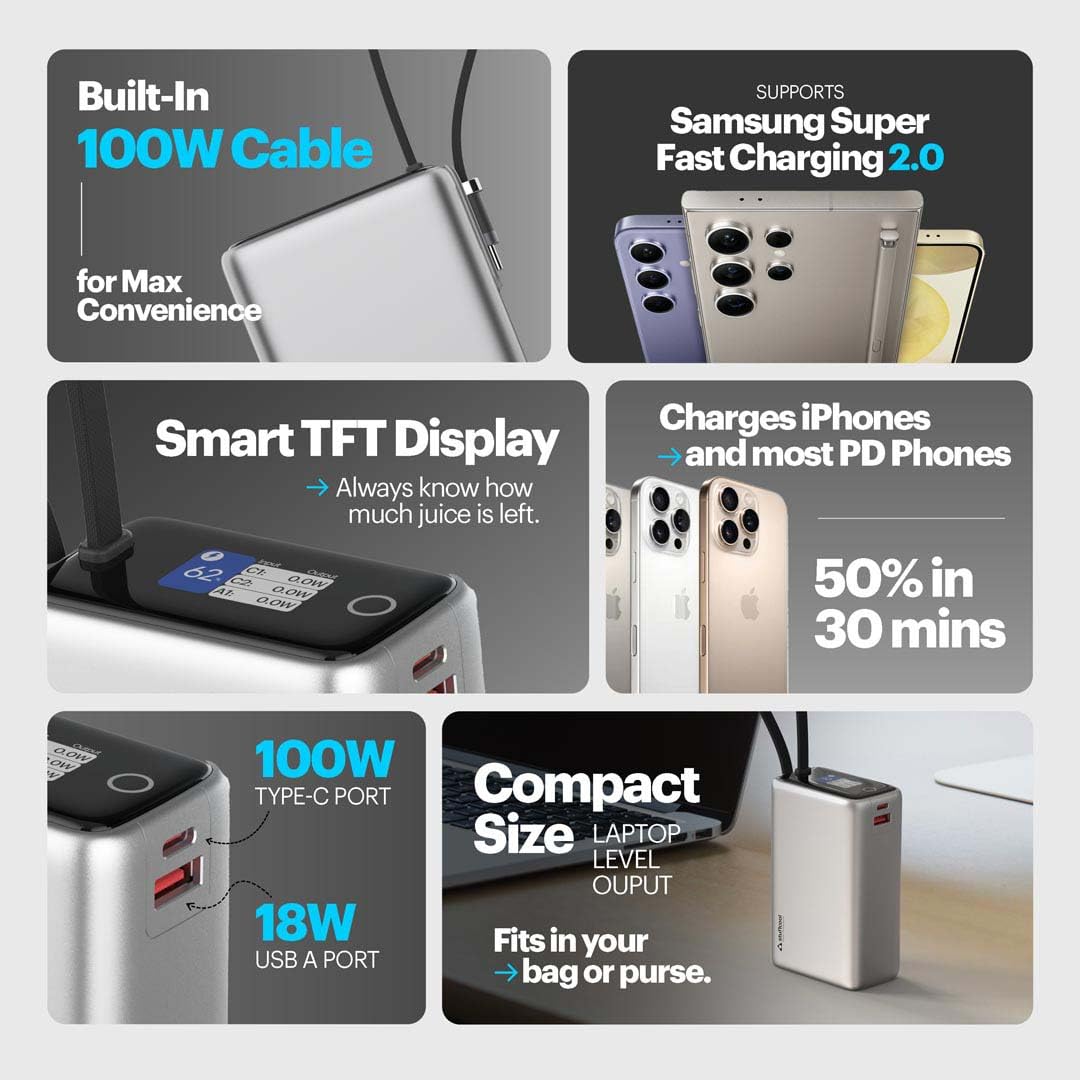 [Built-in 100W Cable.]:Charge your MacBook 14″”/16″”, iPhone, Pixel, DSLR, Nintendo Switch, and more — all using the in-built 100W cable. No untangling, no carrying spares — just plug in and power up in seconds.