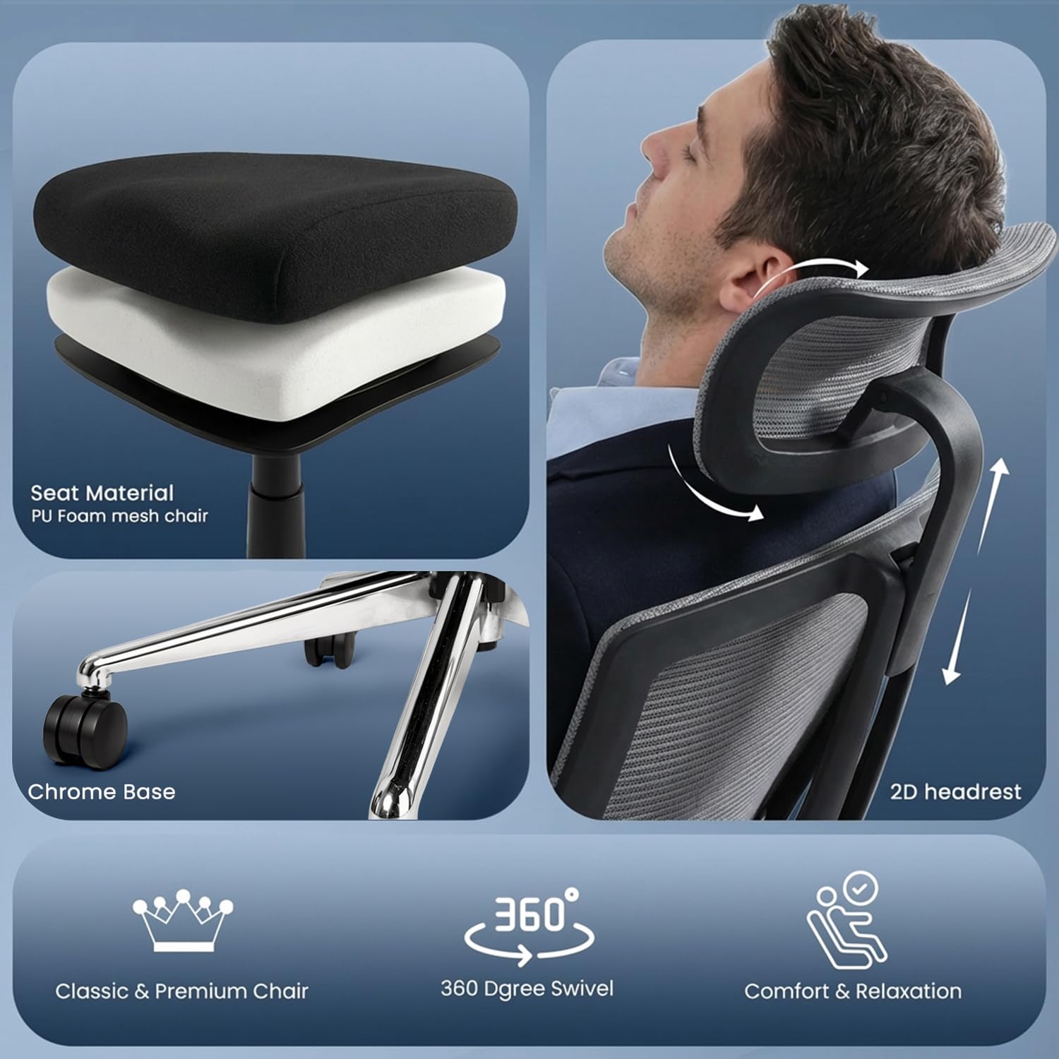 MATERIAL & BUILD: Built with a mesh body, PU foam seat, and a sturdy trapped chrome base with 60mm nylon wheels designed for smooth movement and long-term daily use in office or home setups.