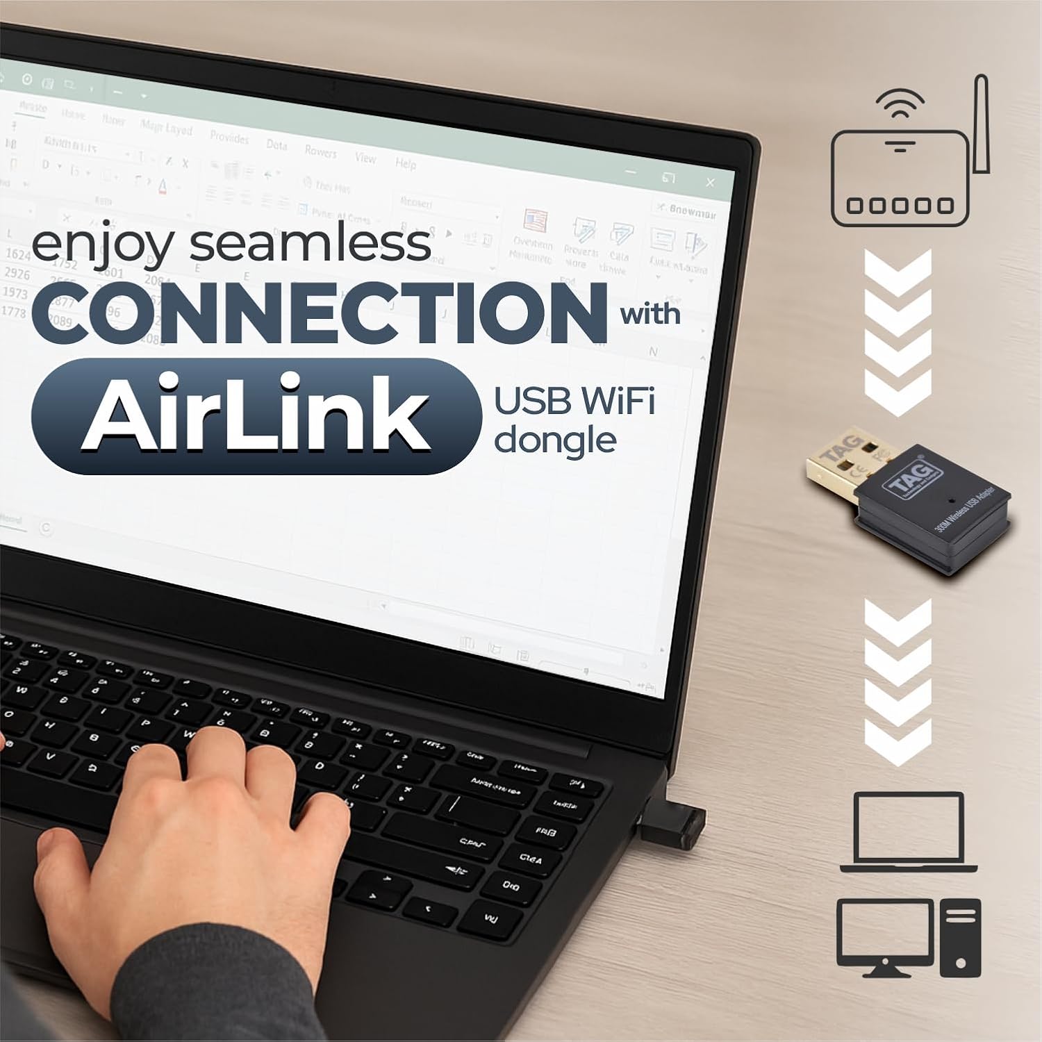TAG Airlink 300 Mbps USB WiFi Adapter | 2.4GHz Mini Wireless Network Dongle for PC/Laptop/Desktop | USB 2.0 | Soft AP Mode | WPA/WPA2 Security | Plug & Play | Black