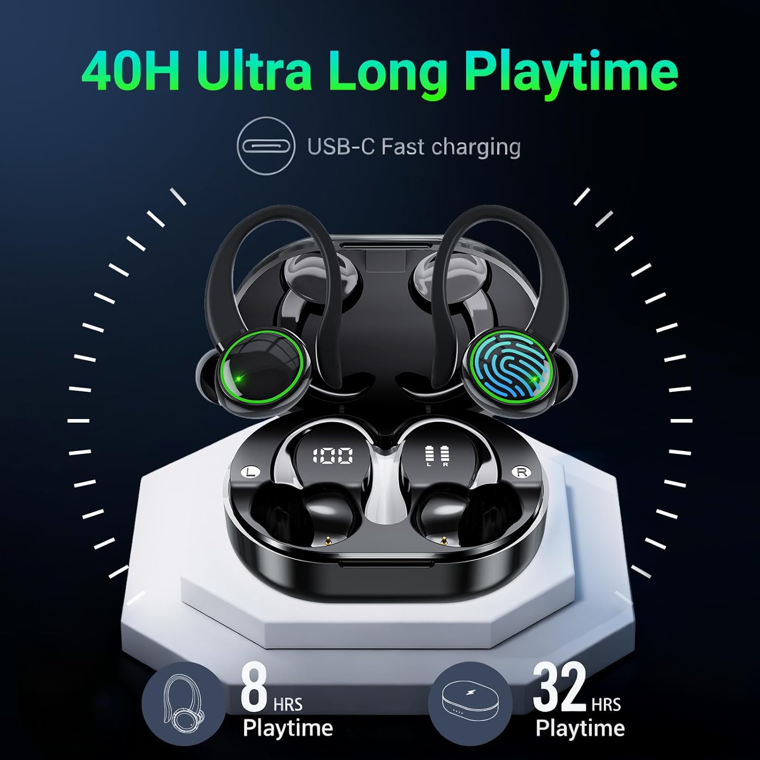 TAGRY Bluetooth Earbuds 5.4 40hrs Playtime Wireless Charging Case Digital Display Sport Ear Buds with Earhooks Deep Bass IP6 Waterproof Over-Ear Earphones for Phone Laptop