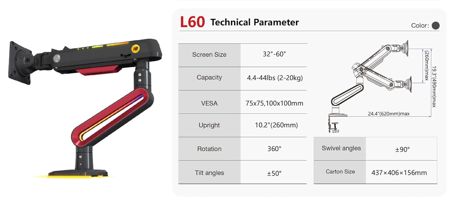 Introducing the TECVITY – L60 Gaming Monitor Arm with RGB Lights. The Monitor arm is the prefect addition to any setup, providing a stylish and secure way to mount your monitor. The Model L50 is designed with durable Metal construction and is capable of supporting a monitor up to 32 to 60 inches in size and up to 2Kg to 20Kg in weight. It is also equipped with a quick release VESA plate, making it easy to quickly attach and detach your monitor. The L60 comes with RGB (red, green, blue) lighting effects. Get the North Bayou NB L60 Gaming Monitor Arm with RGB lights today and take your gaming setup to the next level !!!!