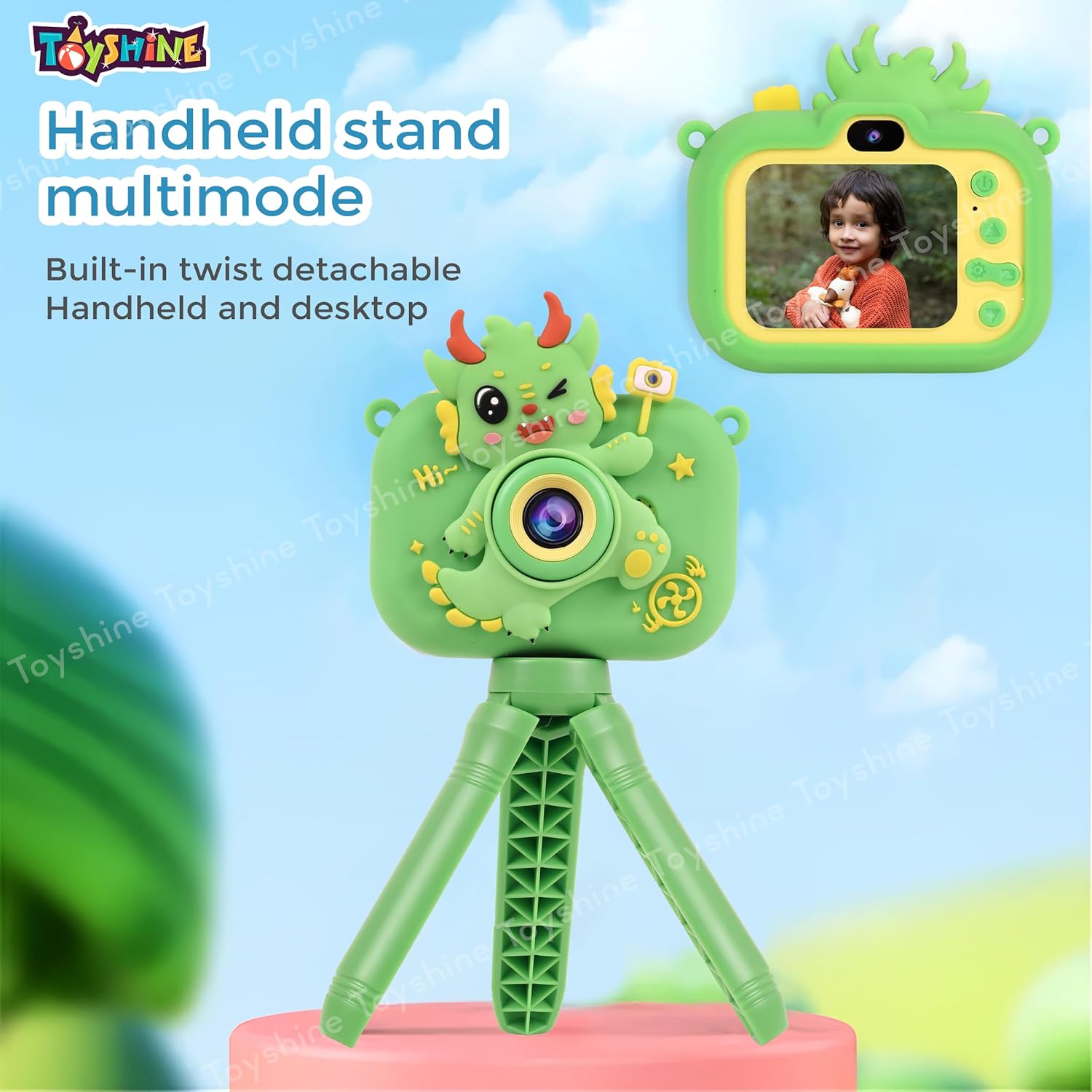 Toyshine Naughty Dino Design Digital HD Camera with Tripod | Cartoon Silicone Cover | Video Recording | Inbuilt Games | Support 32GB SD Card Selfie Toys for Kids Boys Girls 3+ (Green)