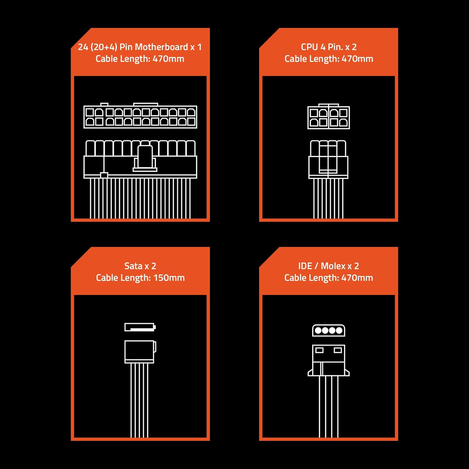 Connectors : SATA x 2, IDE/ Molex x 2 , 24(20+4)Pin motherboard x 1 , CPU 4 Pin x 2. Support SATA Peripherals