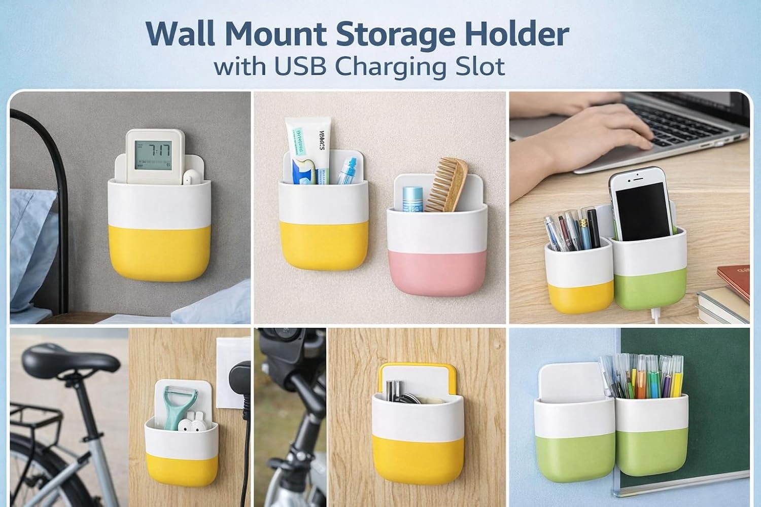 Wall Mount Storage Holder with USB Charging Port, Adhesive Organizer for Mobile Phone, Remote Control, White and Blue