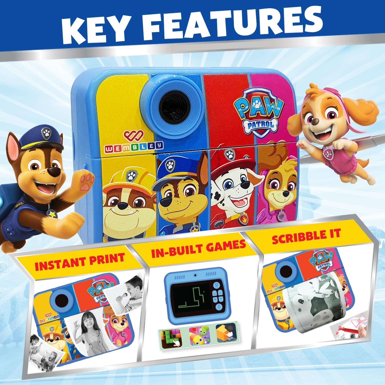 Wembley DIY Instant Print Digital Camera for Kids 3+| Includes Print Rolls, 4GB SD Card & Strap| Fun Birthday Gift for Boys & Girls (Paw Patrol Theme)