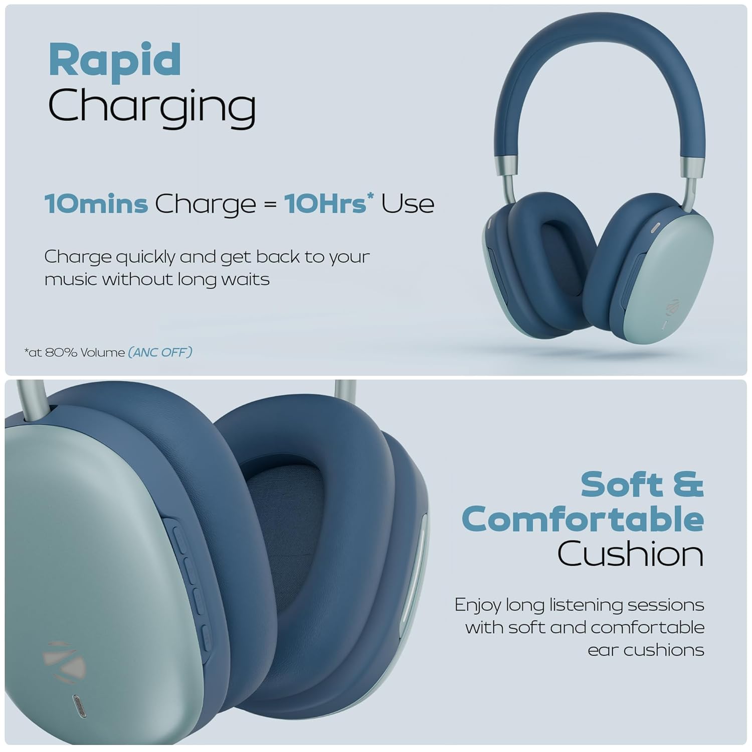 LONG BATTERY LIFE: Built with a 1000mAh battery delivering up to 100hrs* of playback (*at 80% volume with ANC off), along with rapid charging that provides 10 hours of use with just 10 minutes of charge*.