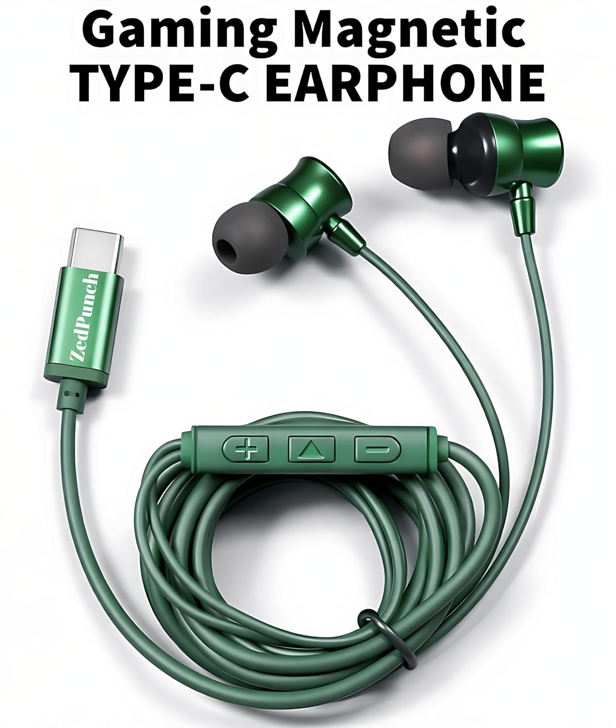 ZedPunch Gaming Magnetic Type-C Earphone, Green, in-Ear Wired Headphones with Mic and 3-Button Control, Premium Sound Quality with Heavy Deep Bass for Android USB-C