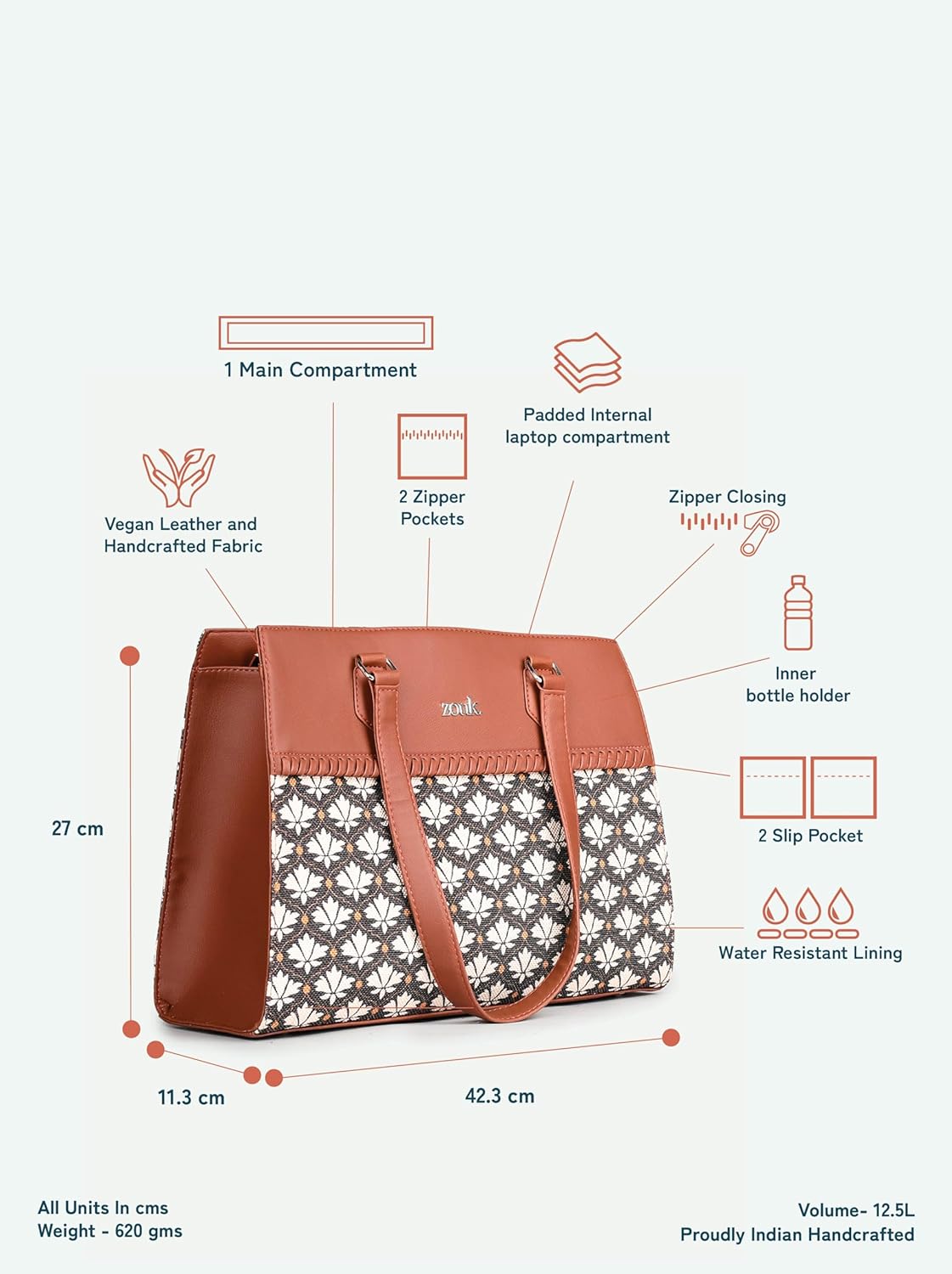 The proudly Indian and 100% PeTA-approved Statement Business Bag blends style and utility for modern professionals. It features a spacious main compartment, built-in slip and zipper pockets, an elastic water bottle holder, and a padded laptop compartment (fits up to 14″). A quick-access back pocket ensures convenience on the go.